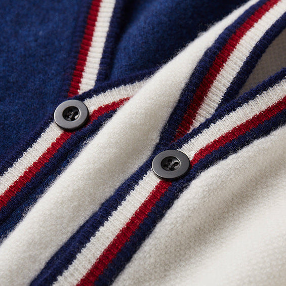 Shaped with intention and crafted from pure cashmere, this cardigan channels quiet confidence through its clean lines and timeless V-neck. The striped trim introduces a tailored point of distinction—an understated mark of a man whose style speaks before he does.