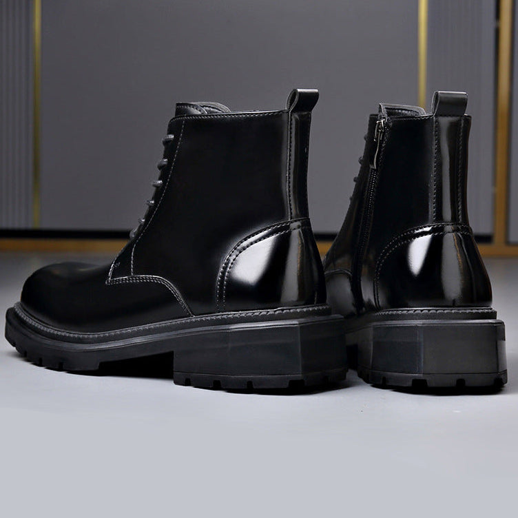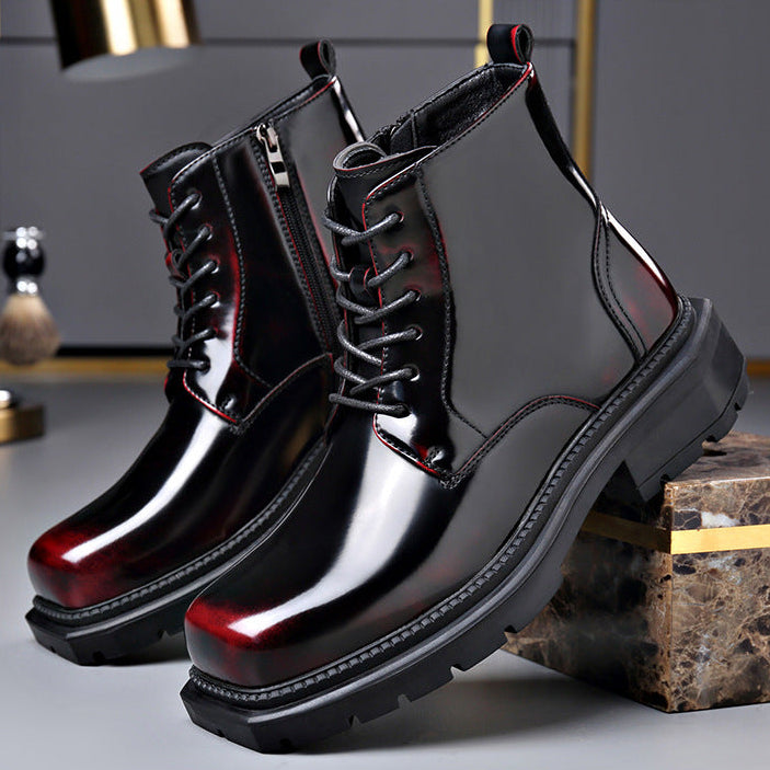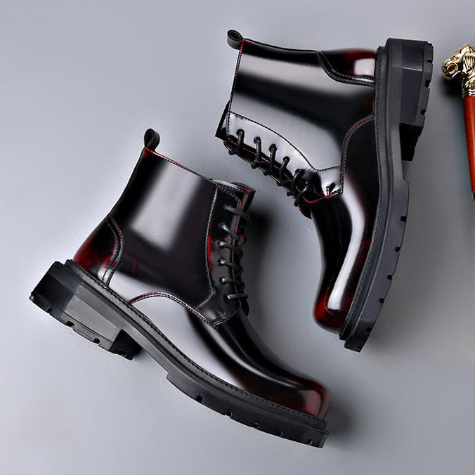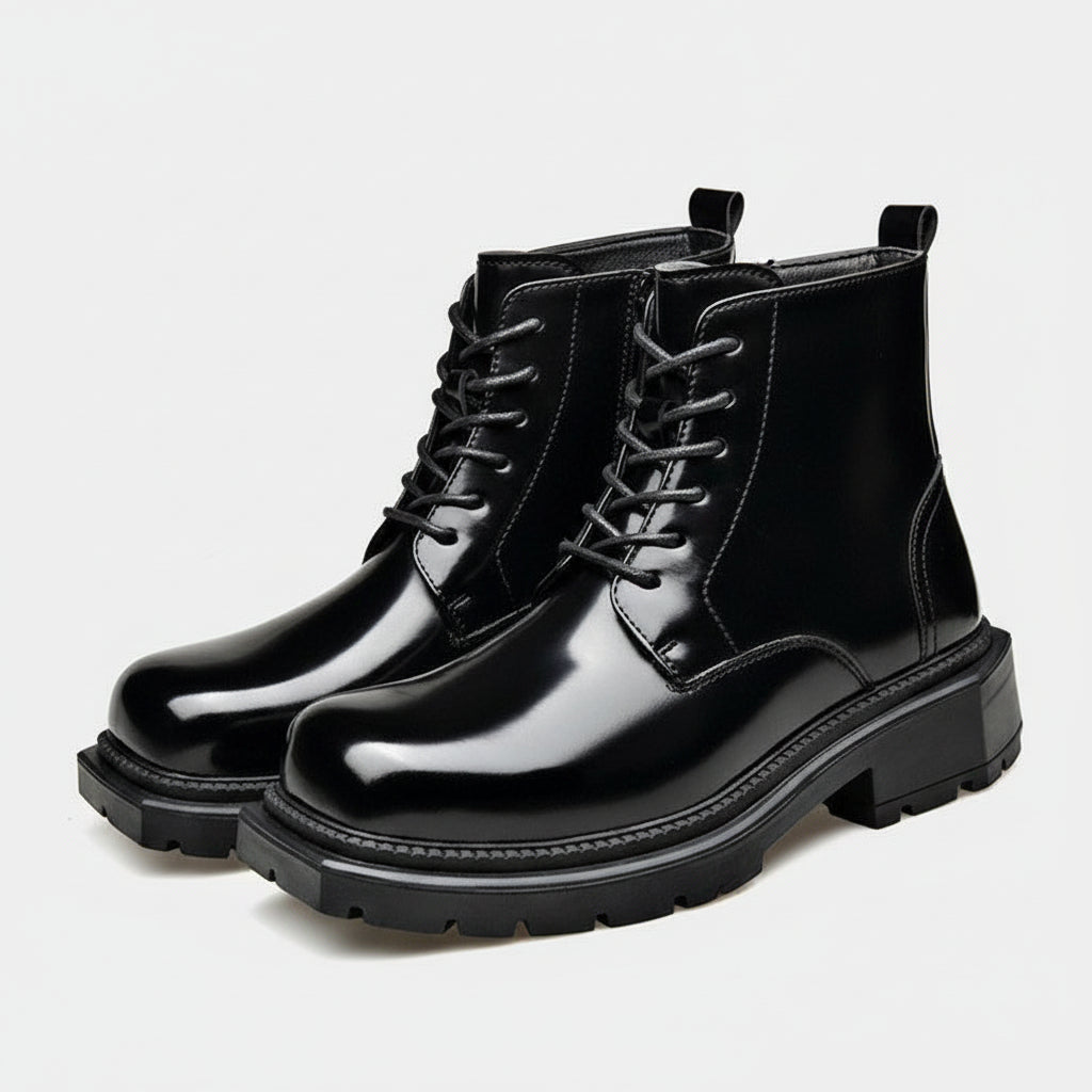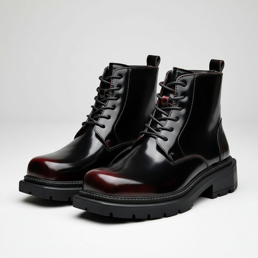 High-shine leather defines the look, giving these lace-up ankle boots a striking, confident presence. Clean paneling and sharp stitching add structure, while a solid lug sole anchors every step with controlled stability.