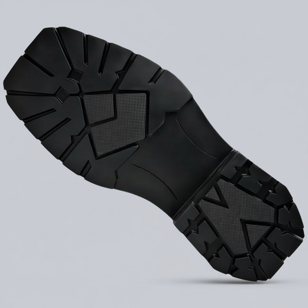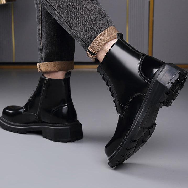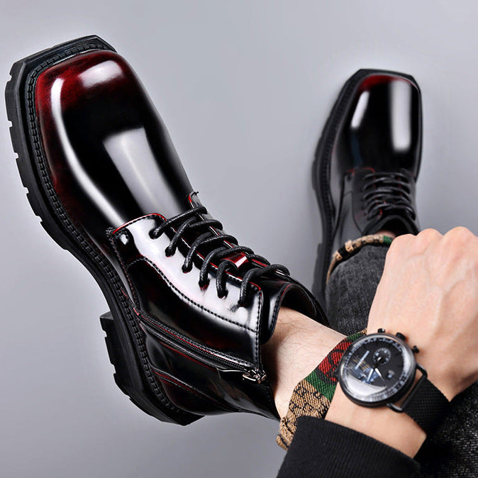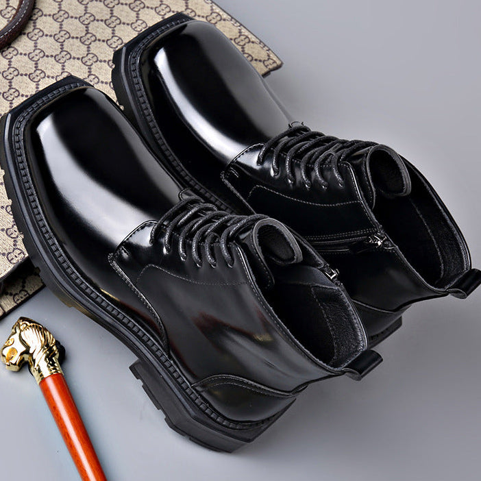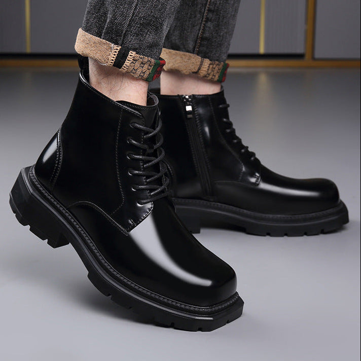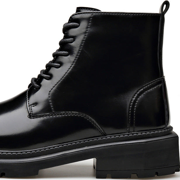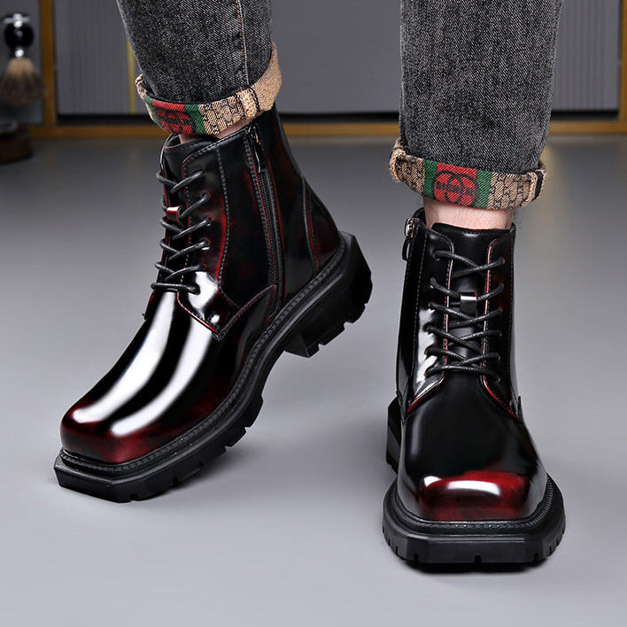 High-shine leather defines the look, giving these lace-up ankle boots a striking, confident presence. Clean paneling and sharp stitching add structure, while a solid lug sole anchors every step with controlled stability.